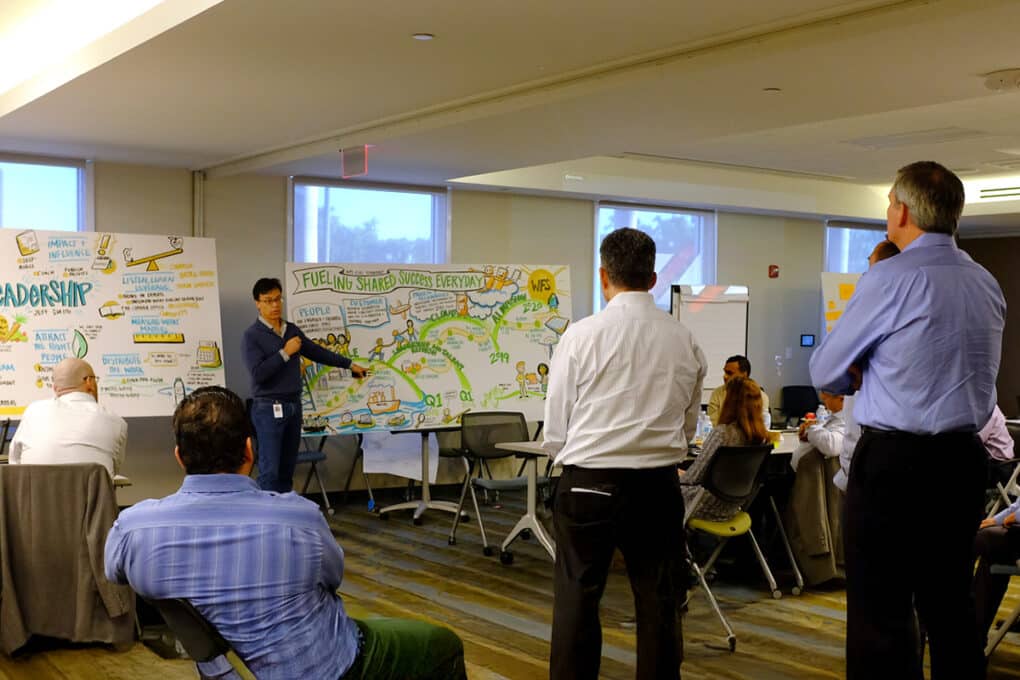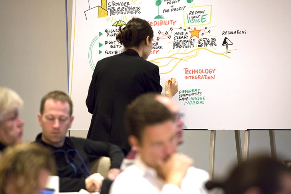 At ImageThink, graphic recording turns meeting and workshop conversation into clear visuals. Our artistically-talented facilitators consult on goals, design agendas and templates, then listen, synthesize, and illustrate ideas in real time. The result is shared understanding, richer participation, and more collaborative decision-making. By seeing strategy unfold on the wall—via sketchnotes, storyboards and concise infographics—teams remember more, align faster, and leave with actionable next steps.